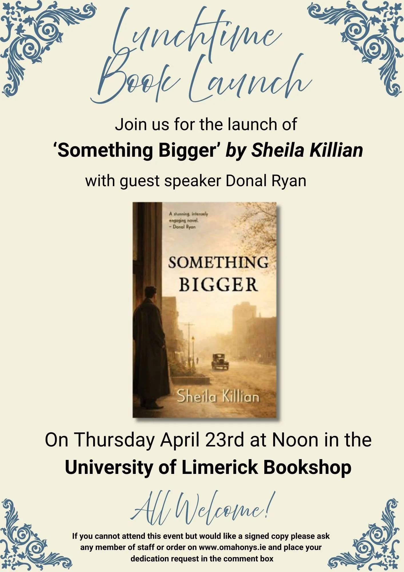 The wonderful award-winning novelist Donal Ryan is the main speaker at a lunchtime launch of Something Bigger, hosted by O’Mahony’s at the University of Limerick Bookshop.